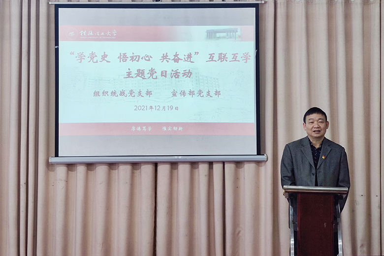 为进一步深化党史学习教育,引导全体党员干部一起回顾党的奋斗历史,做到“学史明理、学史增信、学史崇德、学史力行”,12月19日,学校组织统战党支部、宣传部党支部开展“学党史 悟初心 共奋进”互联互学主题党日活动。学校党委副书记齐俊斌出席此次活动,党委组织部、宣传部、统战部全体党员参加本次活动。