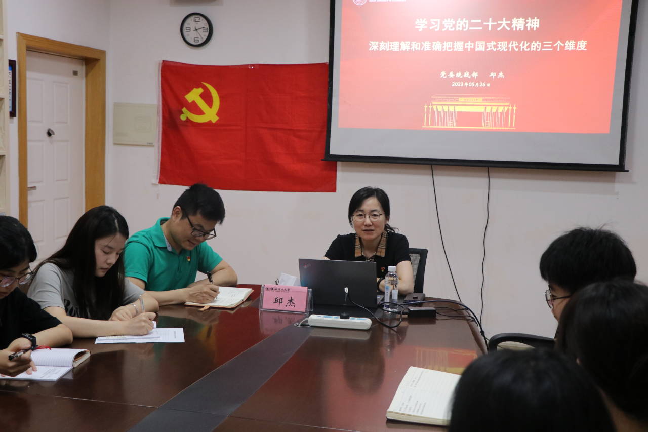 本次党课的学习主题是学习党的二十大精神——深刻理解和准确把握中国式现代化的三个维度。在报告中,邱杰首先回顾了党的二十大报告中有关中国式现代化等方面的内容,并重点从“彰显中国共产党的历史主动精神、验证中国化时代化马克思主义行、开创人类社会实现现代化新道路”三个方面,系统阐释了如何深刻把握中国式现代化的内涵特征和本质要求的问题,并特别指出了中国式现代化与西方资本主义国家现代化的差异。