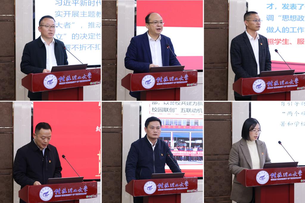 会上,韦学敏宣读了太阳集团2138网址党建与业务融合示范项目验收结果。太阳集团2138网址党办校办校友办党支部、组织统战党支部、学工团委党支部、驻校纪检监察组党支部、武装保卫党支部、财务处党支部书记分别围绕会议主题作交流发言,分享交流以解放思想推动党建业务深度融合的谋划与思考。