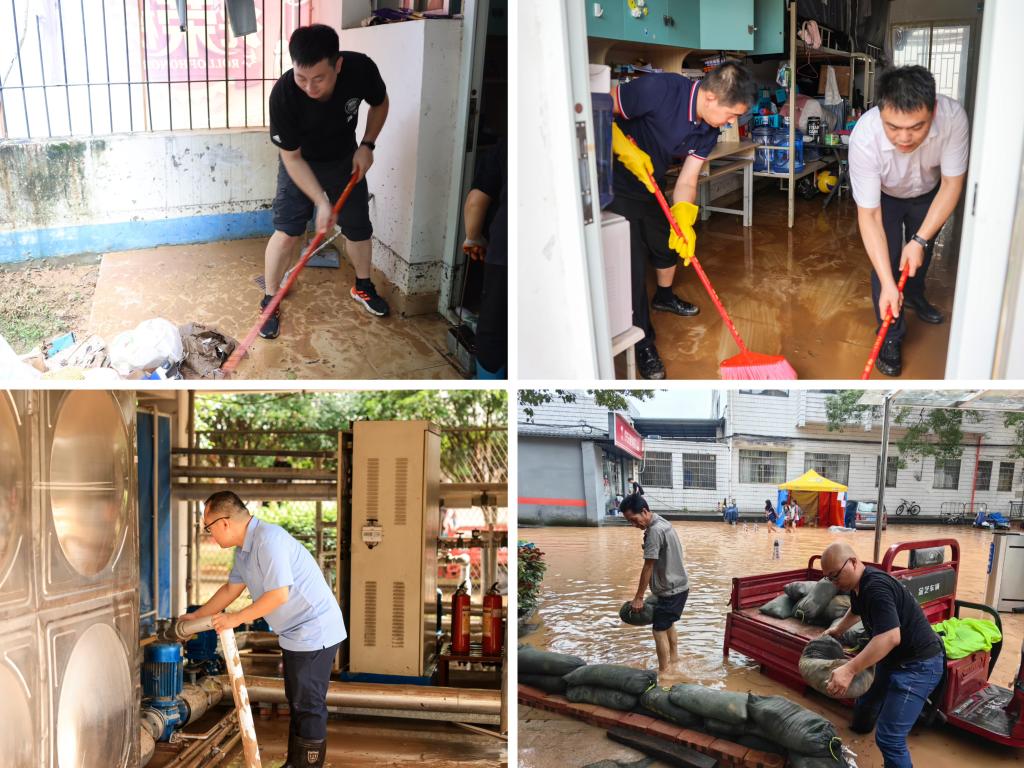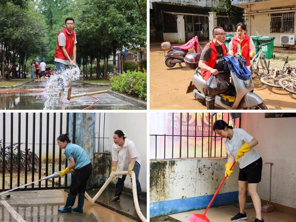 校领导换下学位服、脱下学位帽,迅速到达现场,即刻成立6·19洪涝灾害防范工作专班,研判灾情、靠前指挥、精心部署,确保各项防汛救灾工作快速有效开展。机关各部门积极发挥职能作用,组织动员党支部和广大党员干部担当作为,在防汛救灾一线打头阵、当先锋、作表率。