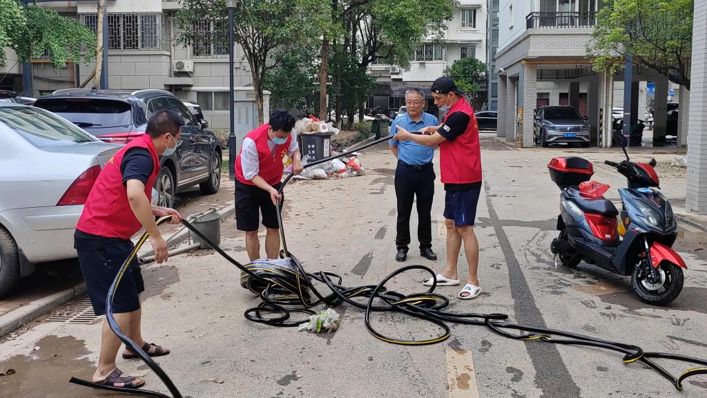 灾后重建,各地物资异常紧缺。受洪水影响,东城小区消防栓全部处于停水状态,清淤工作受到严重考验。先到一步的财务处党支部率先发现问题,支部党员们发挥财务人“能挑重担、敢于创新”的精神,在小区内四处奔波研判,大胆提出截取楼栋主水管的妙招,有效解决用水问题。