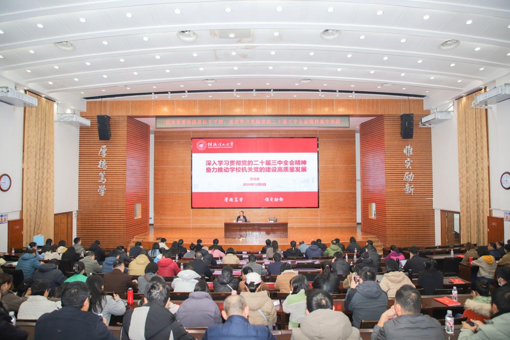 张成龙作了题为《深入学习贯彻党的二十届三中全会精神 奋力推动学校机关党的建设高质量发展》的专题辅导报告。报告从党的二十届三中全会精神的核心要义出发,深刻阐述了如何在新时代背景下准确把握教育事业改革新方向,激发学校高质量发展新活力。他强调,全体机关干部要紧紧围绕学校党委行政战略部署,走在前列、作好表率,以实干实效实绩服务保障学校高质量发展。