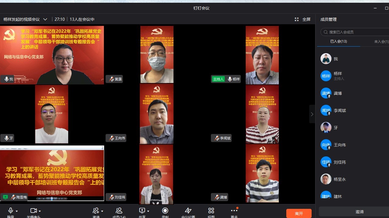 为有效扎实推进理论和业务工作深度融合,做好新学期党建工作。9月6日,网络与信息中心党支部召开新学期支部会议,会议由支部书记杨祥同志主持,全体党员、预备党员参会,会议以钉钉线上虚拟会议室方式举行。