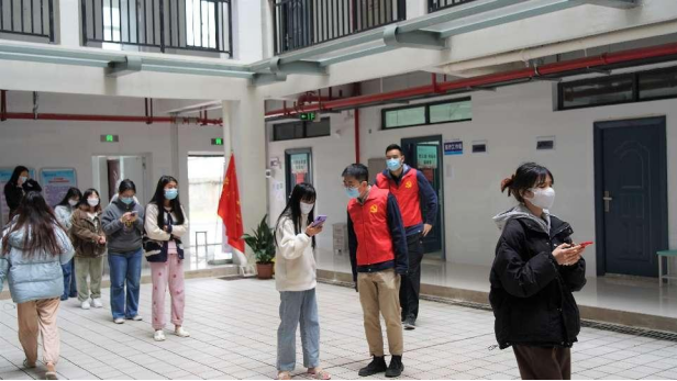 “请同学们佩戴好口罩,按一米间隔排队。”全员核酸检测现场,支部组织党员正在引导学生有序排队进行核酸检测。4月12、13日,学校在屏风、雁山两校区开展全员核酸检测。为保证全员核酸检测工作有序、顺利进行,支部党员主动担当、积极作为,34名党员分时段、分批次深入全员核酸检测点和健康观察点,引导师生员工按秩序候场、入场、扫码、录入信息。“一个党员就是一面旗帜,在疫情这场大考面前,广大党员同志要冲锋在前、奋斗在战‘疫’一线。在学校和师生群众需要我们的时候,我们更应该主动奉献自己的力量。”支部党员魏俊儒表示,积极参与学校各项疫情防控工作,努力为广大师生群众营造安全稳定、和谐有序的学习生活环境,是支部党员贯彻落实全心全意为人民服务宗旨的切实体现。