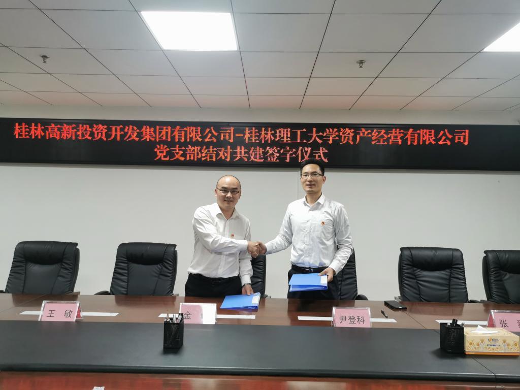 为拓宽校企在基层党组织建设中协作共赢的途径,围绕“五好”党支部建设目标,4月15日,资产公司与桂林高新投资开发集团有限公司举行党支部结对共建签字仪式。