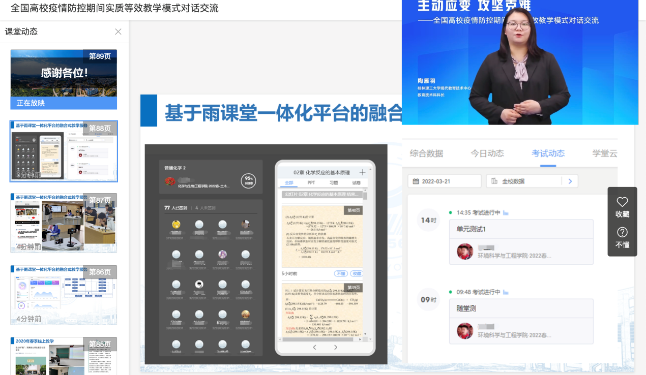 当前,正值全国高校新学期伊始,全国各地新冠肺炎疫情呈多点散发态势。为协助学校顺利实现线下授课到线上教学、线上线下融合式教学等课堂教学模式的迁移,引导广大教师积极有效开展实质等效的线上教学活动,加强全国高校间的工作交流与思想碰撞,最大限度保证疫情防控期间学校正常的教学进度和教学质量,近日,学堂在线通过雨课堂直播方式,举办了“全国高校疫情防控期间实质等效教学模式对话活动”,我校委派网络与信息中心党支部党员陶雁羽同志参加了此次活动并作主题分析。
