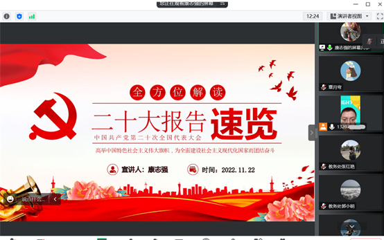 11月22日下午,教务处党支部开展了二十大精神专题党课暨理论学习活动,活动由支部书记游少鸿同志主持,支部全体党员通过线上参加本次学习活动。