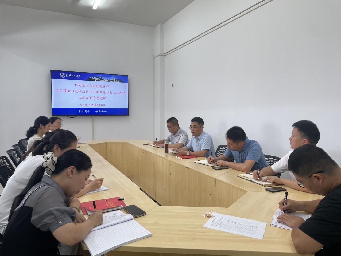 为进一步深入开展学习贯彻习近平新时代中国特色社会主义思想主题教育,5月31日下午,人事处党支部在雁山校区行知楼B618开展主题教育专题党课,党支部书记辛立章同志以“坚持学思践悟 感悟思想伟力”为题,为支部全体党员讲授专题党课。
