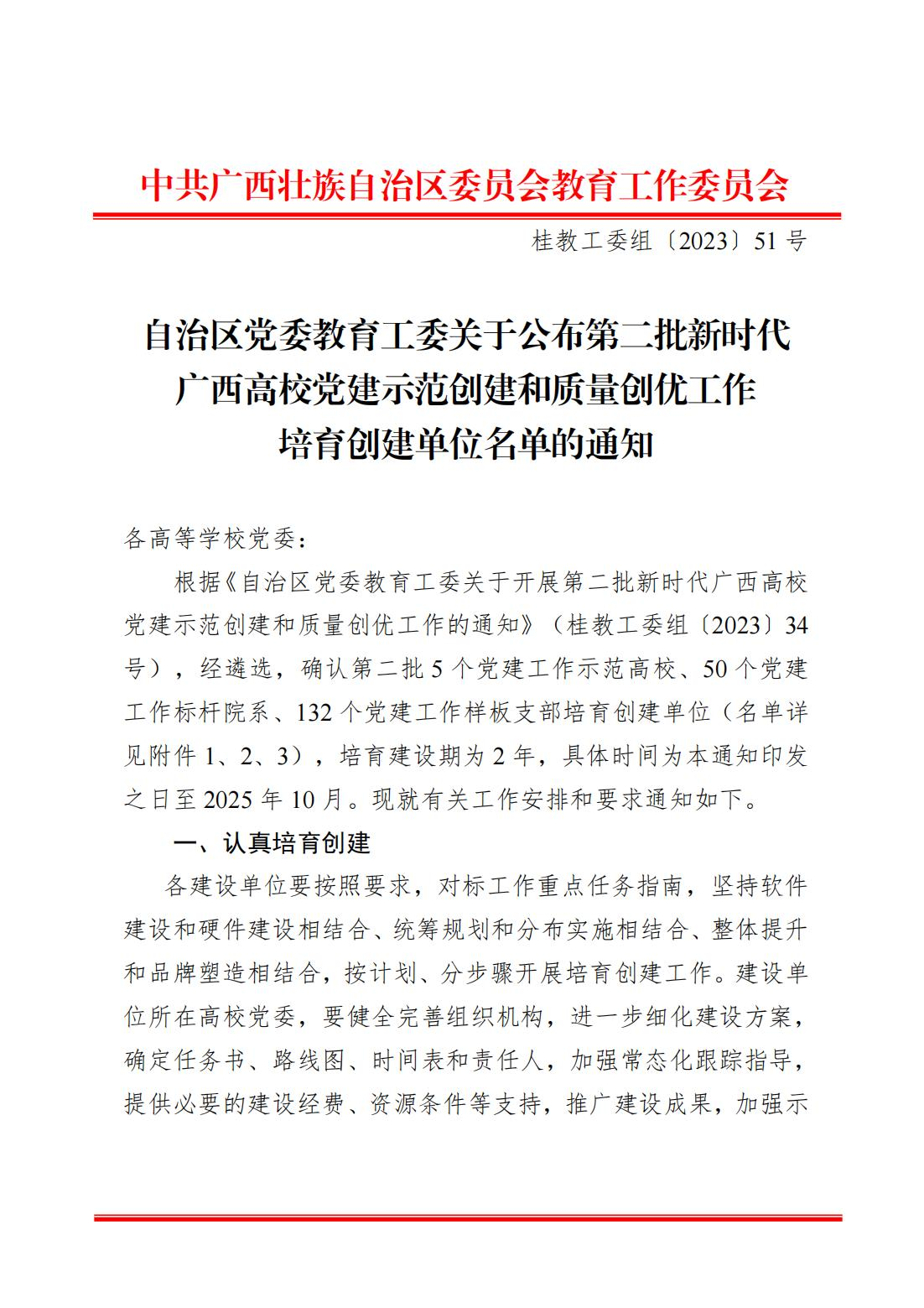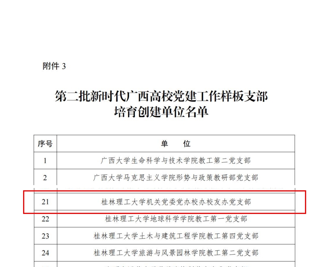 近日,自治区党委教育工委公布了第二批新时代广西高校党建示范创建和质量创优工作培育创建单位名单。我校太阳集团2138网址党办校办校友办党支部荣获第二批新时代广西高校党建工作样板支部培育创建单位。