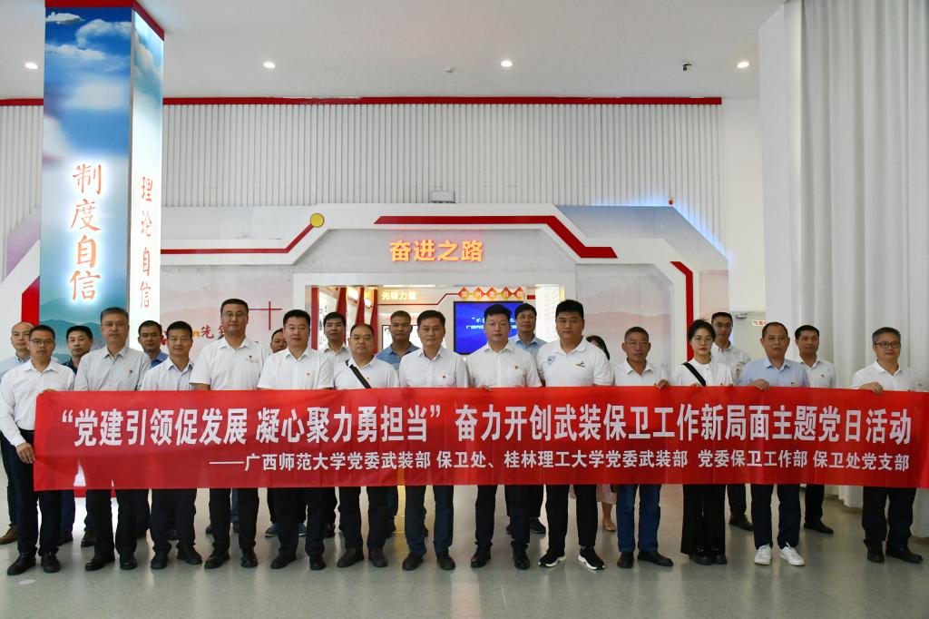 为全面贯彻落实新时代党的建设总要求和新时代党的组织路线,充分发挥党建引领作用,5月9日,学校党委武装部、党委保卫工作部、保卫处党支部与广西师范大学党委武装部保卫处党支部组织党员赴贺州市钟山县红色古镇英家镇开展以“党建引领促发展、凝心聚力勇担当”为主题的结对共建主题党日活动,两校武装保卫党支部全体党员参加。