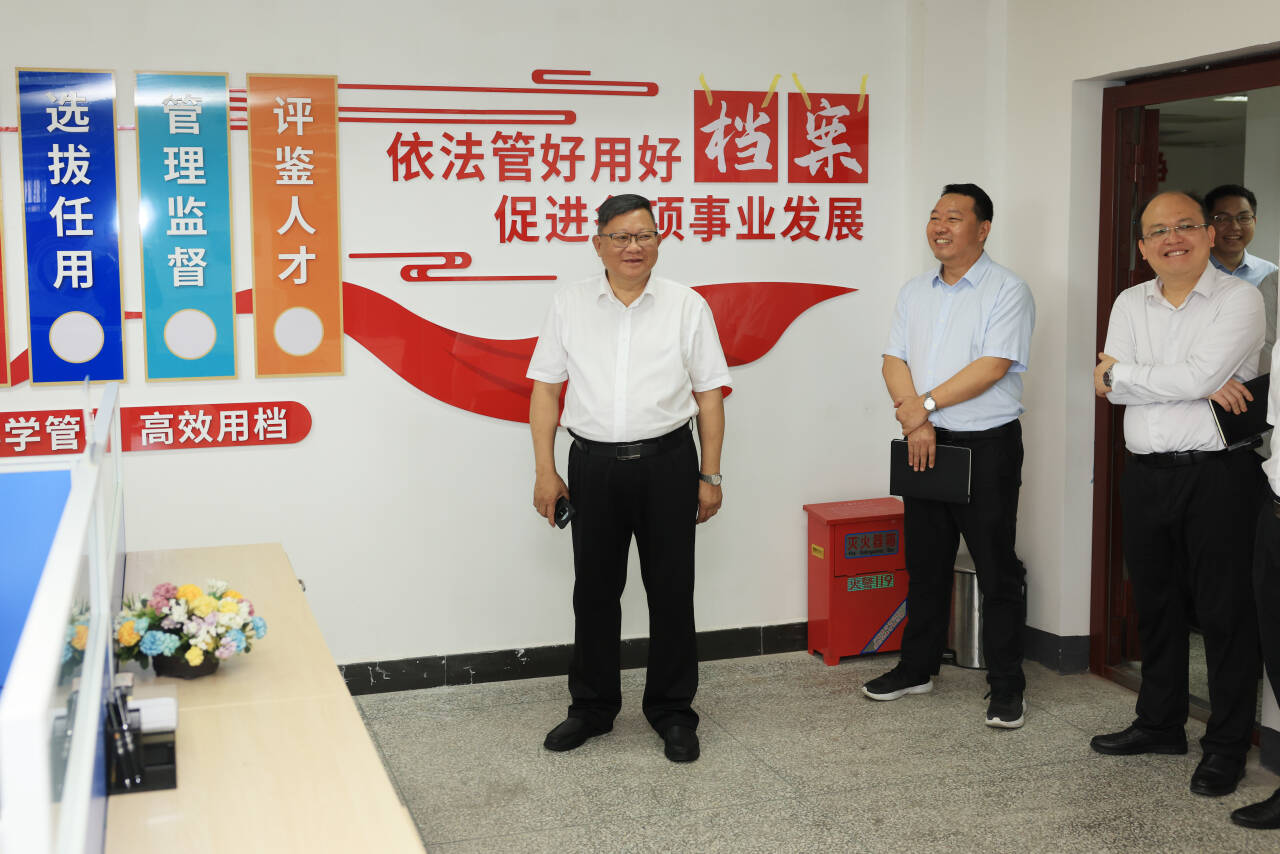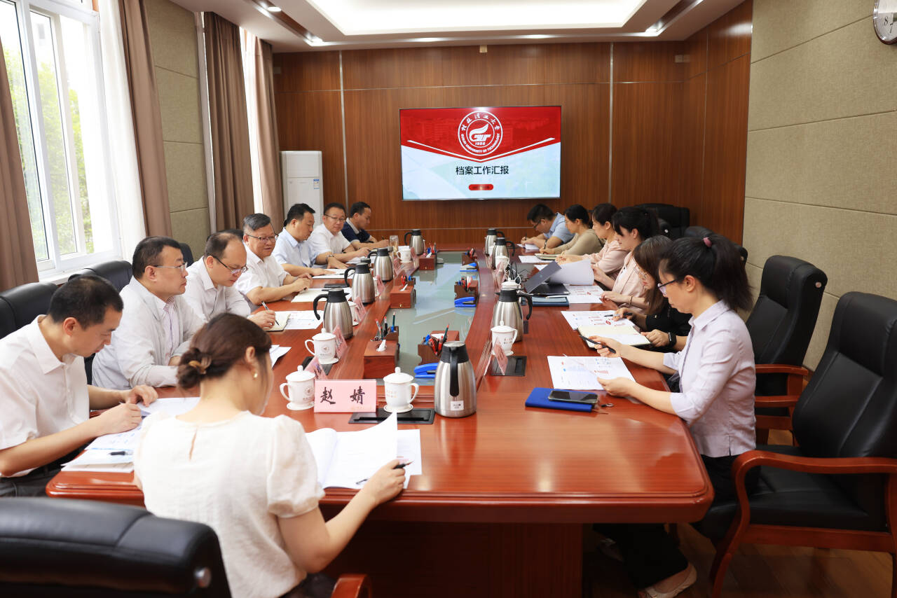 邓军一行听取了档案馆负责人关于档案工作现状及主要成绩、档案工作存在的主要问题、下一步工作思路和亟待解决的困难等情况的汇报,对档案馆成立以来在开展档案管理标准化规范化建设等方面取得的成绩给予高度肯定,并就档案馆建设场地、人员配备、建设经费等问题进行现场办公,逐一提出解决方案和指导意见。他指出,档案馆自成立以来,全体档案干部职工以爱岗敬业的精气神、过硬的工作作风,用心用情用力推进档案工作提质增效,档案工作目标明确、重点突出、措施有力,为推动学校加快发展高质量发展贡献了“档案力量”。
